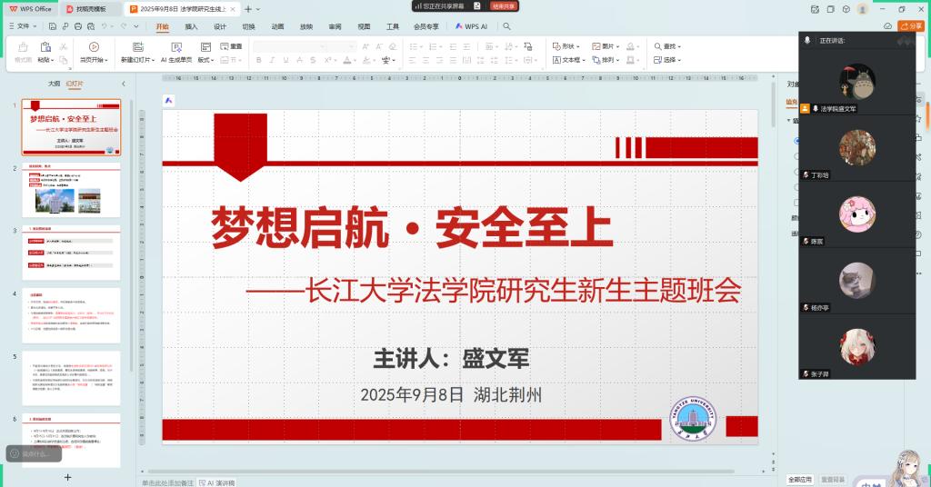 (通讯员 肖芳)9月8日,公司以“梦想启航·安全至上”为主题,召开2025级研究生新生线上主题班会,由辅导员盛文军主讲,为新生入学答疑解惑。会上,盛文军明确新生报到时间为9月13日下午-9月14日,地点在东校区文科大楼B区1110室,公司在荆州火车站、长途客运站设接站点,校园所有门均可进入。同时,他详细说明报到前需加入年级群改备注、用“今日校园”APP完成认证、备齐身份证等证件,提醒新生提前自行缴费,并就报到时的注意事项着重进行了强调。针对经济困难新生,公司将凭相关证明办理“绿色通道”。此外,对新生报到时的安全进行了详细的讲解,提醒新生注意安全。