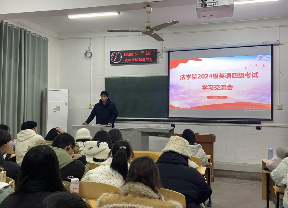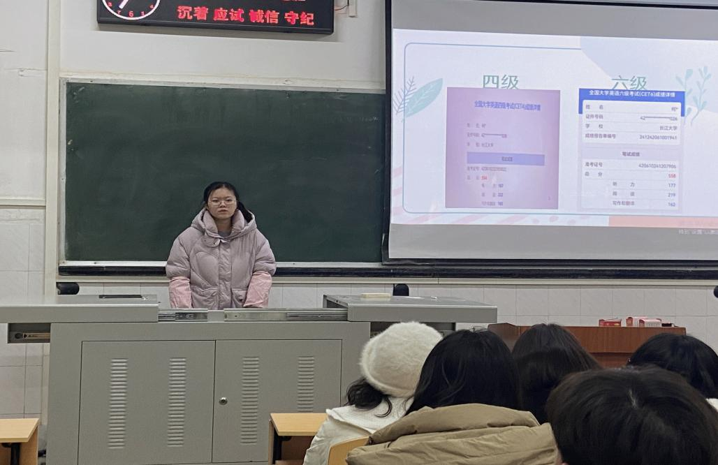 (通讯员:李玉豪/文 向若涵/图)为了全力支持2024级员工在即将到来的英语四级考试中取得佳绩,12月11日晚,一场以“经验分享,决战四级”为主题的英语四级考试交流会在西校区二教306室举行。此次交流会由23级曾祥学长与柯淼学姐主讲,李玉豪同学主持,高英班全体同学参加。