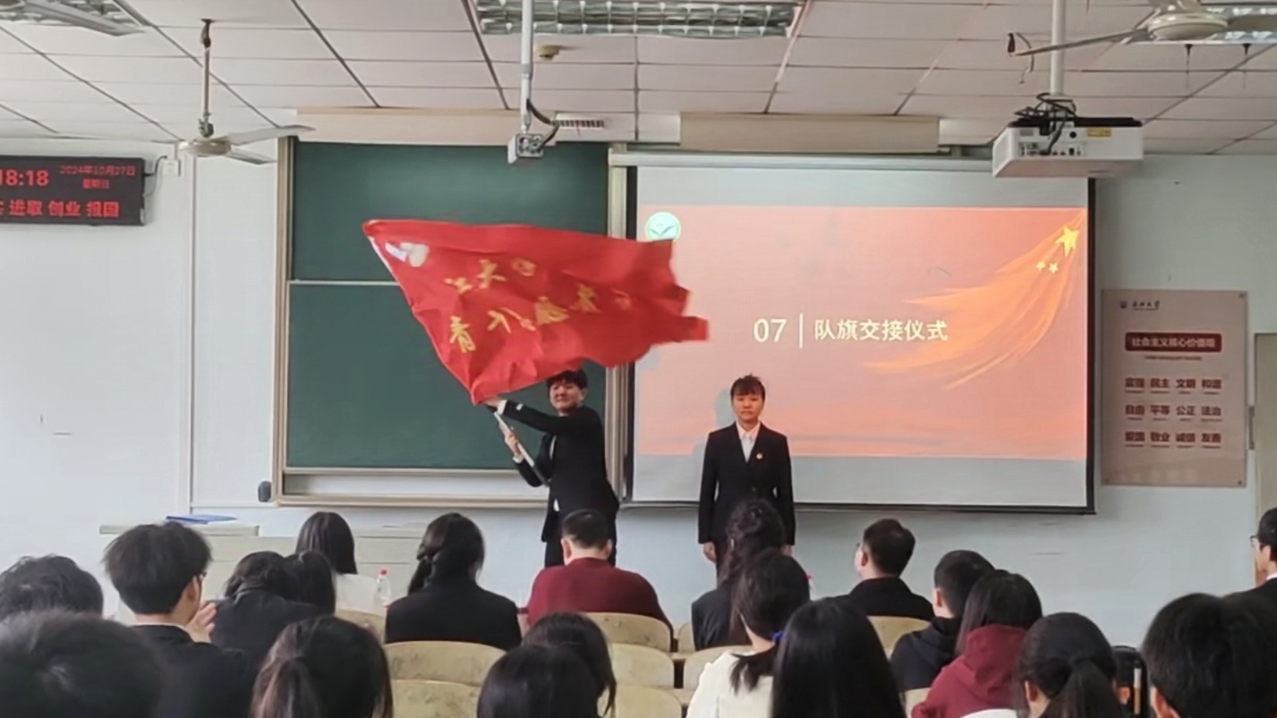 大会进行第五项,举行庄严的队旗交接仪式,飘扬的队旗象征着青年志愿者们的使命与荣耀。现任队长张道重也在接下队旗后对下一步工作作出明确规划,指出将继续秉承“服务社会、锻炼自我、传播法治、弘扬正气”的宗旨,进一步创新志愿服务模式,拓宽服务领域,提升服务质量,努力将beats365青年志愿者服务队打造成为一支更加专业化、规范化、有影响力的志愿服务队伍。大会进行第六项,吴敏老师宣读beats365熠阳青年志愿者支队新成员名单,对新成员的加入表示热烈欢迎,希望全体队员能够在未来一年的工作中踔厉奋发、勇毅前行。