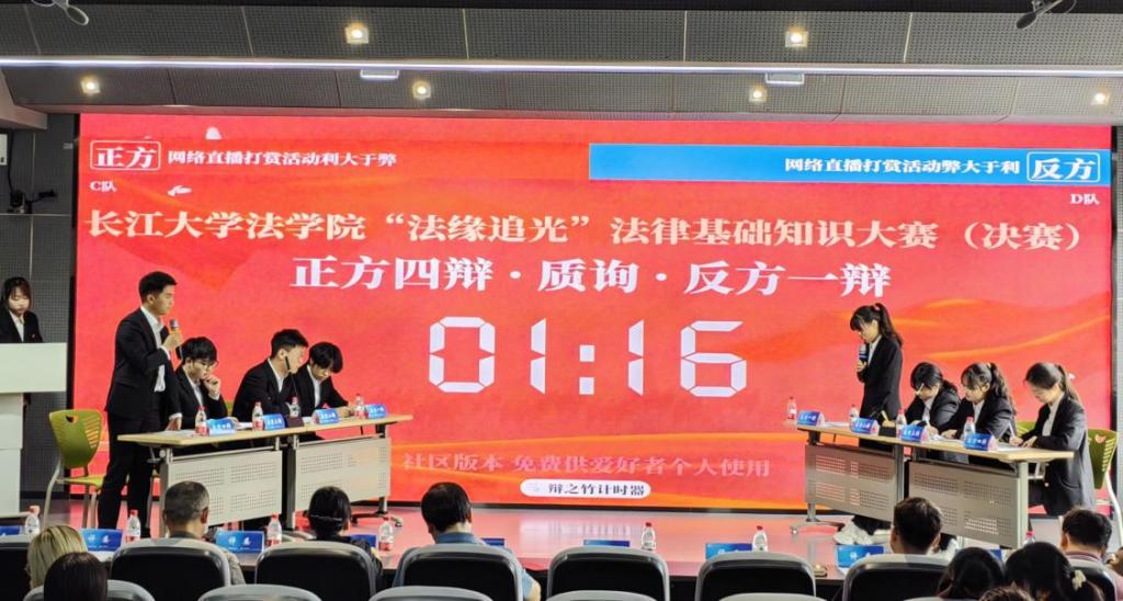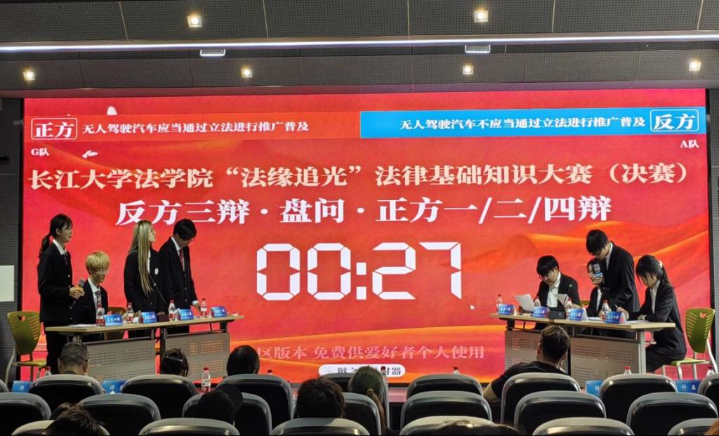 比赛共分为初赛决赛两阶段。初赛以关于宪法、法理学、婚姻家庭继承法知识点相关问题的抢答积分赛形式展开,经过激烈角逐,六支队伍、共24名同学成功晋级决赛。决赛采用辩论赛形式,正反双方各三支队伍依次围绕“网络直播打赏活动利大于弊”、“chat GPT生成的文章是否应当享有知识产权”“无人驾驶汽车是否应当通过立法进行推广普及”等热点话题展开激烈辩论。