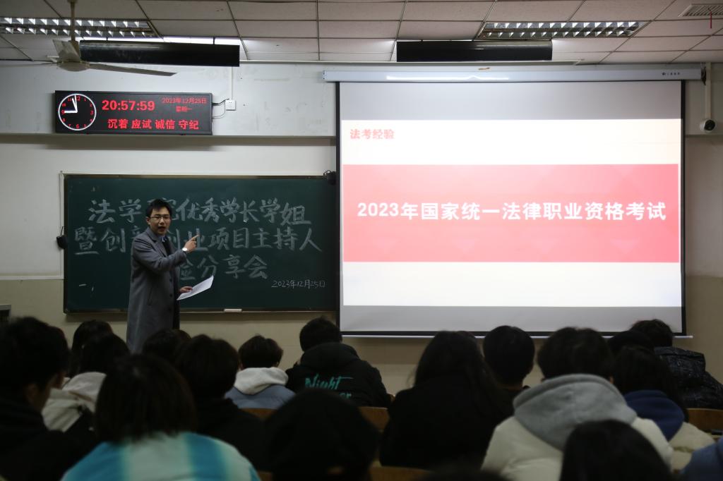 随后,骆语杰学长用幽默的语言将自己的学习和求职过程中的反思总结倾囊相授,分别从实习经验、法考经验、大学经验向大家进行讲述。通过梳理考研、法考、考公的关系,对同学们的未来规划进行指导,传授给同学们一些实用的大学经验,趣味横生,反响热烈。