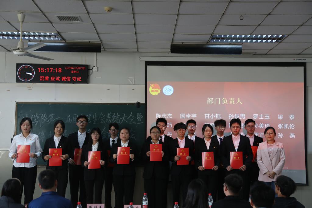 在庄严的国歌声中,大会正式拉开帷幕。为表彰第十一届团委员工会全体成员过去一年的踏实工作,大会首先为其颁发聘书和荣誉证书。本次大会还邀请众多嘉宾为这个值得铭记的时刻发表讲话,其中,第十一届团委员工会主席团代表冯其莉将立志做“有深度、有温度、有宽度”的员工组织作为她对院会发展的新期待;第十二届主席团代表田晋宇和新干事代表王梦苑上台发言时,也分别表达了对院会的工作要求与未来愿景。大会接近尾声,党委书记周胜美进行总结致辞,他提到:“看见员工会注入了这么多新鲜血液,我由衷地感到高兴”,话语间表达了对第十二届团委员工会全体成员的严格要求与殷切期望。最后,参会全体人员在横幅上签名表达祝福,并集体合影留念。