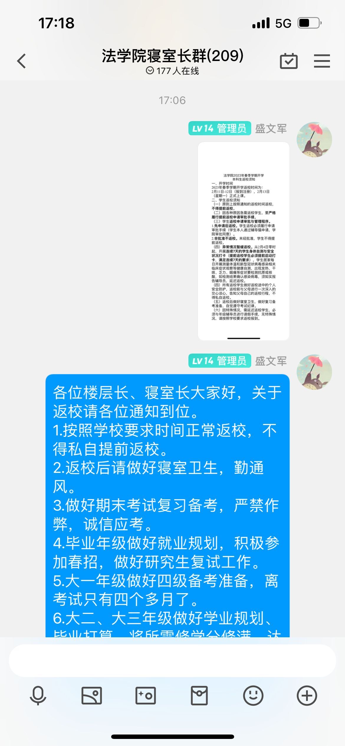 2月4日下午17时,公司组织楼层长、寝室长在公司寝室长群内召开了2023年春季学期返校安全工作会议,会议由辅导员盛文军主持。