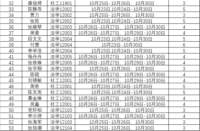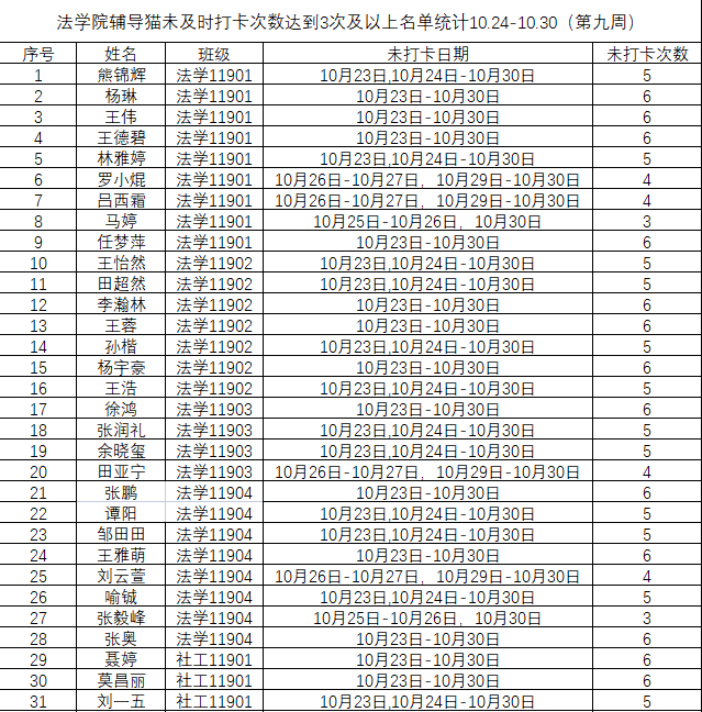 根据公司要求,2022年10月24日——10月30日(第九周)组织全体本科生进行每日“辅导猫”打卡。经分管辅导员、学工助理、班干部多次提醒,仍有53名同学未在规定时间内完成打卡,具体未打卡次数及日期如下:(表格显示)