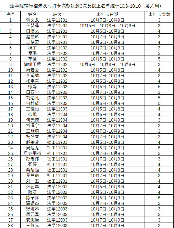 根据公司要求,2022年10月3日——10月9日(第六周)组织全体本科生进行每日“辅导猫”打卡。经分管辅导员、学工助理、班干部多次提醒,仍有38名同学未在规定时间内完成打卡,具体未打卡次数及日期如下:(表格显示)