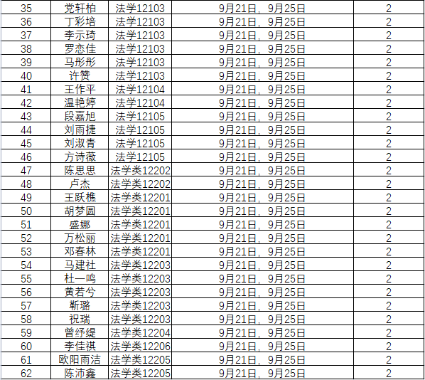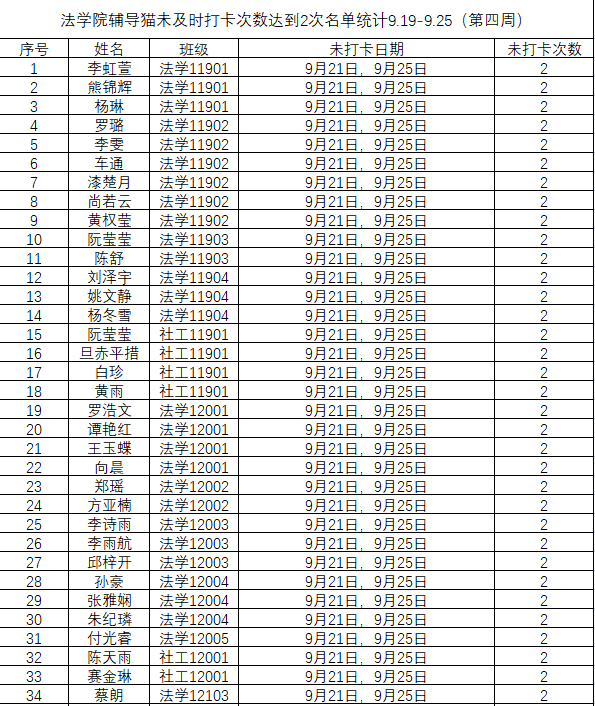根据公司要求,2022年9月19日——9月25日(第四周)组织全体本科生进行每日“辅导猫”打卡。经分管辅导员、学工助理、班干部多次提醒,仍有62名同学未在规定时间内完成打卡,具体未打卡次数及日期如下:(表格显示)