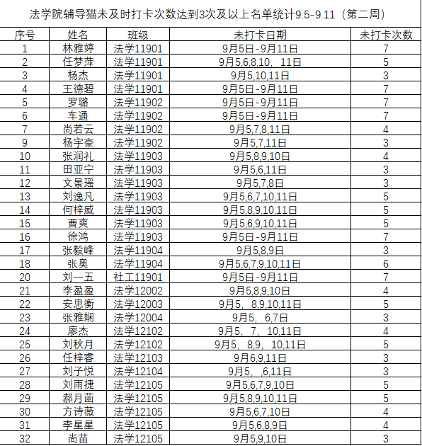 根据公司要求,2022年9月5日——9月11日(第二周)组织全体本科生进行每日“辅导猫”打卡。经分管辅导员、学工助理、班干部多次提醒,仍有32名同学未在规定时间内完成打卡,具体未打卡次数及日期如下:(表格显示)