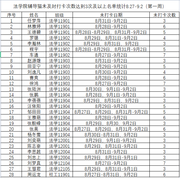 根据公司要求,2022年8月27日——9月2日(第一周)组织全体本科生进行每日“辅导猫”打卡。经分管辅导员、学工助理、班干部多次提醒,仍有28名同学未在规定时间内完成打卡,具体未打卡次数及日期如下:(表格显示)