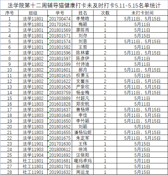 根据公司要求,2022年5月11日、5月15日(第十二周)组织全体本科生进行每日“辅导猫”打卡。经分管辅导员、学工助理、班干部多次提醒,仍有28名同学未在规定时间内完成打卡,具体未打卡次数及日期如下:(表格显示)