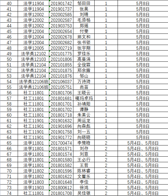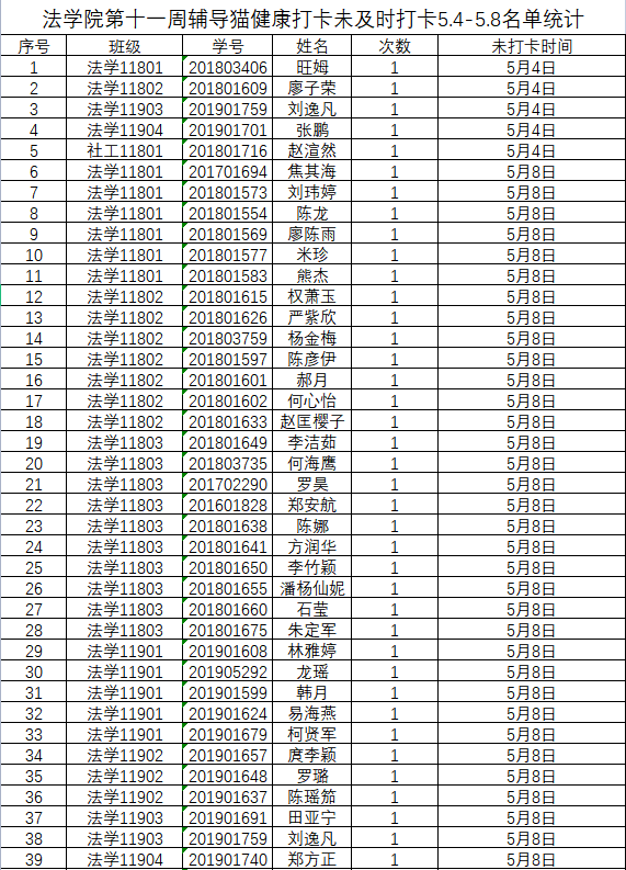 根据公司要求,2022年5月4日、5月8日(第十一周)组织全体本科生进行每日“辅导猫”打卡。经分管辅导员、学工助理、班干部多次提醒,仍有74名同学未在规定时间内完成打卡,具体未打卡次数及日期如下:(表格显示)