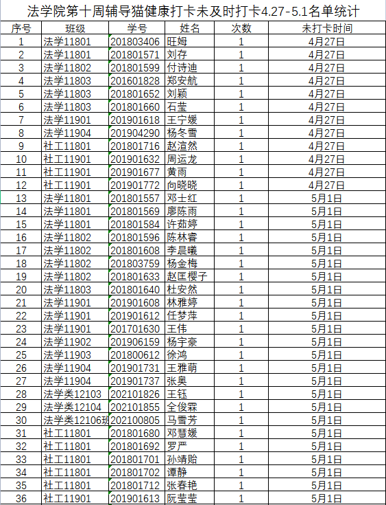 根据公司要求,2022年4月27日、5月1日(第十周)组织全体本科生进行每日“辅导猫”打卡。经分管辅导员、学工助理、班干部多次提醒,仍有49名同学未在规定时间内完成打卡,具体未打卡次数及日期如下:(表格显示)
