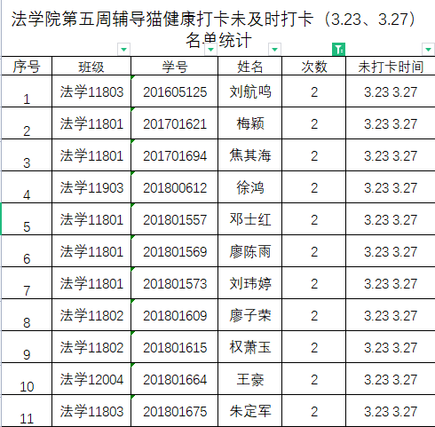 根据公司要求,2022年3月23日、3月27日(第五周)组织全体本科生进行每日“辅导猫”打卡。经分管辅导员、学工助理、班干部多次提醒,仍有11名同学未在规定时间内完成打卡,具体未打卡次数及日期如下:(表格显示)