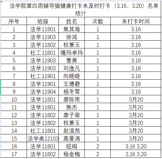 根据公司要求,2022年3月16日、3月20日(第四周)组织全体本科生进行每日“辅导猫”打卡。经分管辅导员、学工助理、班干部多次提醒,仍有17名同学未在规定时间内完成打卡,具体未打卡次数及日期如下:(表格显示)