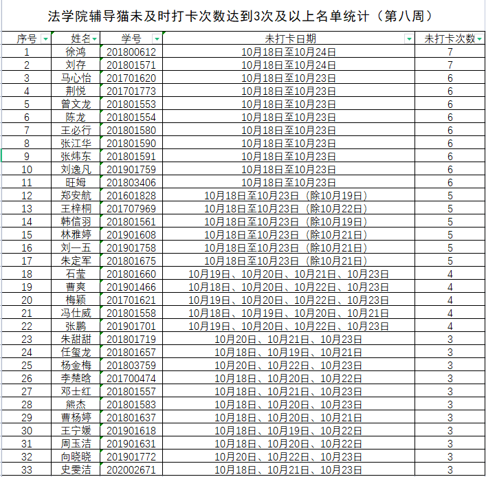 根据公司要求,2021年10月18日-10月24日(第八周)组织全体本科生进行每日“辅导猫”打卡。经分管辅导员、学工助理、班干部多次提醒,仍有33名同学未在规定时间内完成打卡,具体未打卡次数及日期如下:(表格显示)