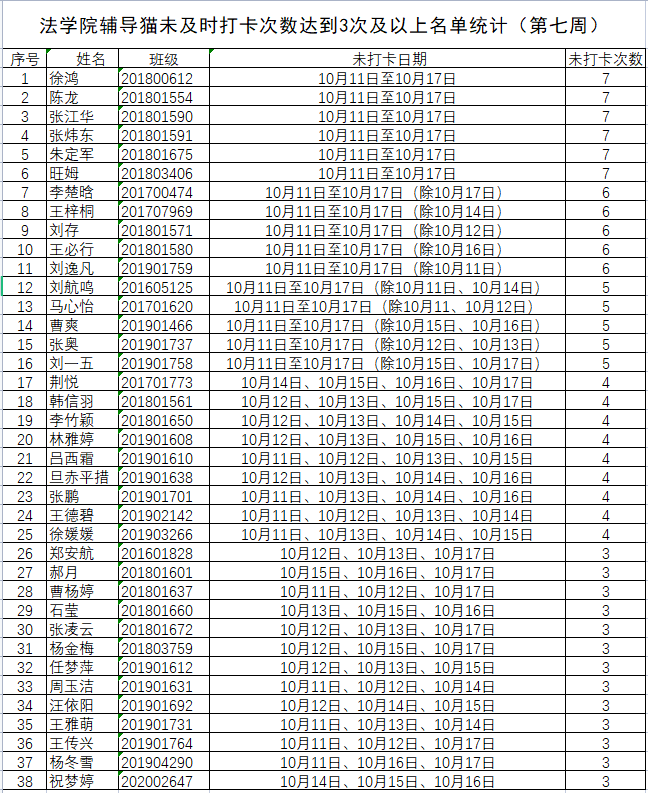 根据公司要求,2021年10月11日-10月17日(第七周)组织全体本科生进行每日“辅导猫”打卡。经分管辅导员、学工助理、班干部多次提醒,仍有38名同学未在规定时间内完成打卡,具体未打卡次数及日期如下:(表格显示)