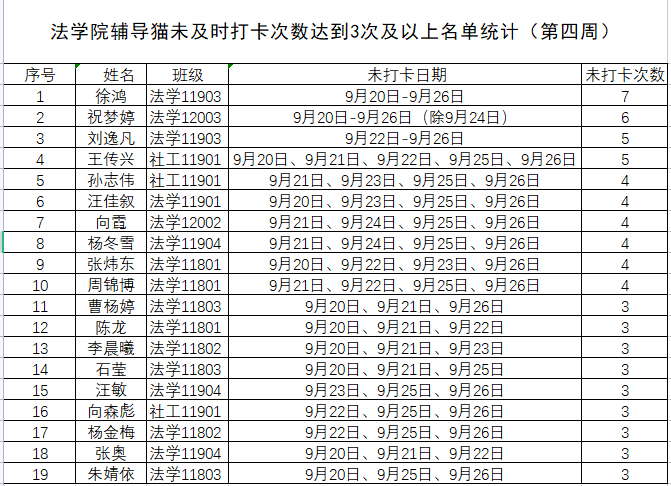 根据公司要求,2021年9月20日-9月26日(第四周)组织全体本科生进行每日“辅导猫”打卡。经分管辅导员、学工助理、班干部多次提醒,仍有19名同学未在规定时间内完成打卡,具体未打卡次数及日期如下:(表格显示)