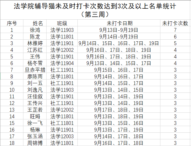 根据公司要求,2021年9月13日-9月19日(第三周)组织全体本科生进行每日“辅导猫”打卡。经分管辅导员、学工助理、班干部多次提醒,仍有18名同学未在规定时间内完成打卡,具体未打卡次数及日期如下:(表格显示)