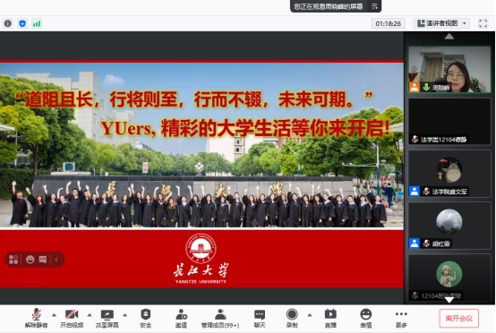 会议最后为自由发言和提问环节。法学类12103班韩畅同学表达了对老员工活的期望以及大学四年的规划。同学们针对来校报到及学习生活等方面也提出了很多问题,老师们在线为同学们一一解答,为新生报到做好了充足准备。
