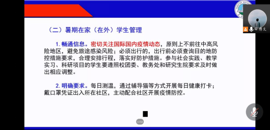 紧接着,从暑期在校员工管理和暑期在家(在外)员工管理两方面重点强调了员工管理制度,要求同学们做到每日测温、通过辅导猫进行每日健康打卡、及时报告身体状况、密切关注国际国内疫情动态、非必要不外出、积极注射疫苗等要求,多次强调其必要性与重要性。