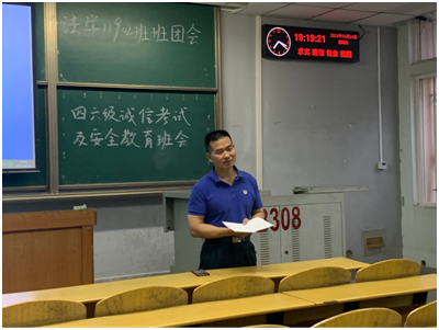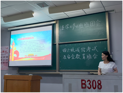 在法学11902班的班会上,公司党委书记周胜美老师向同学们讲解了安全教育相关的内容,包括防诈骗、防溺水等方面,并为大家举例讲解,以此提醒同学们不要接听陌生来电,提高反诈骗的意识。随后关于防溺水方面,倡导同学们到规范的游泳池游泳,不到陌生水域游泳,保护生命安全。正值英语四六级考试之际,在班会最后也进行了考风考纪教育,提醒同学们不要作弊,认真对待考试。