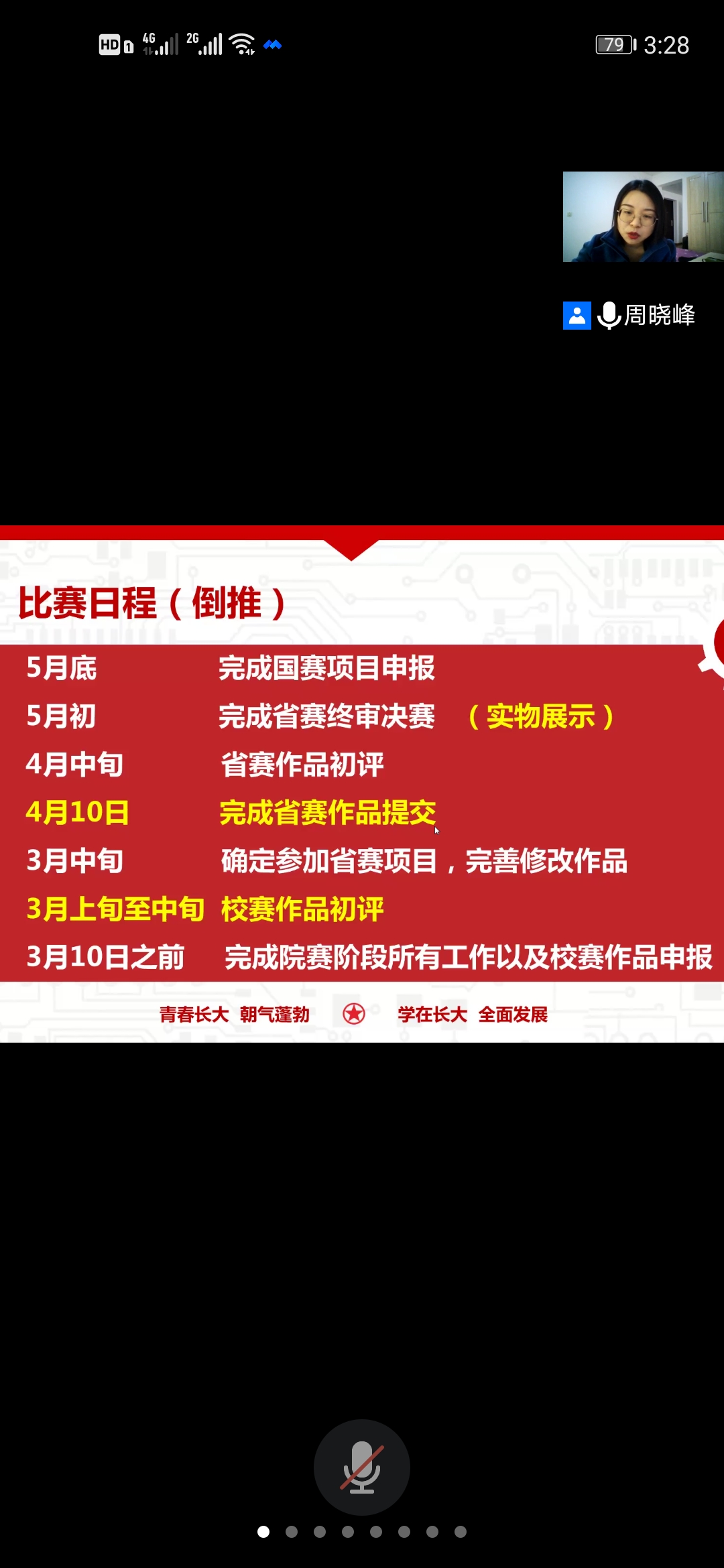 周晓峰老师向同学们介绍了“挑战杯”的参赛资格、时间要求、评审规则、竞赛改革等方面的情况,并强调了作品申报书填写相关注意事项。随后,周老师针对同学们的提问一一做了解答。