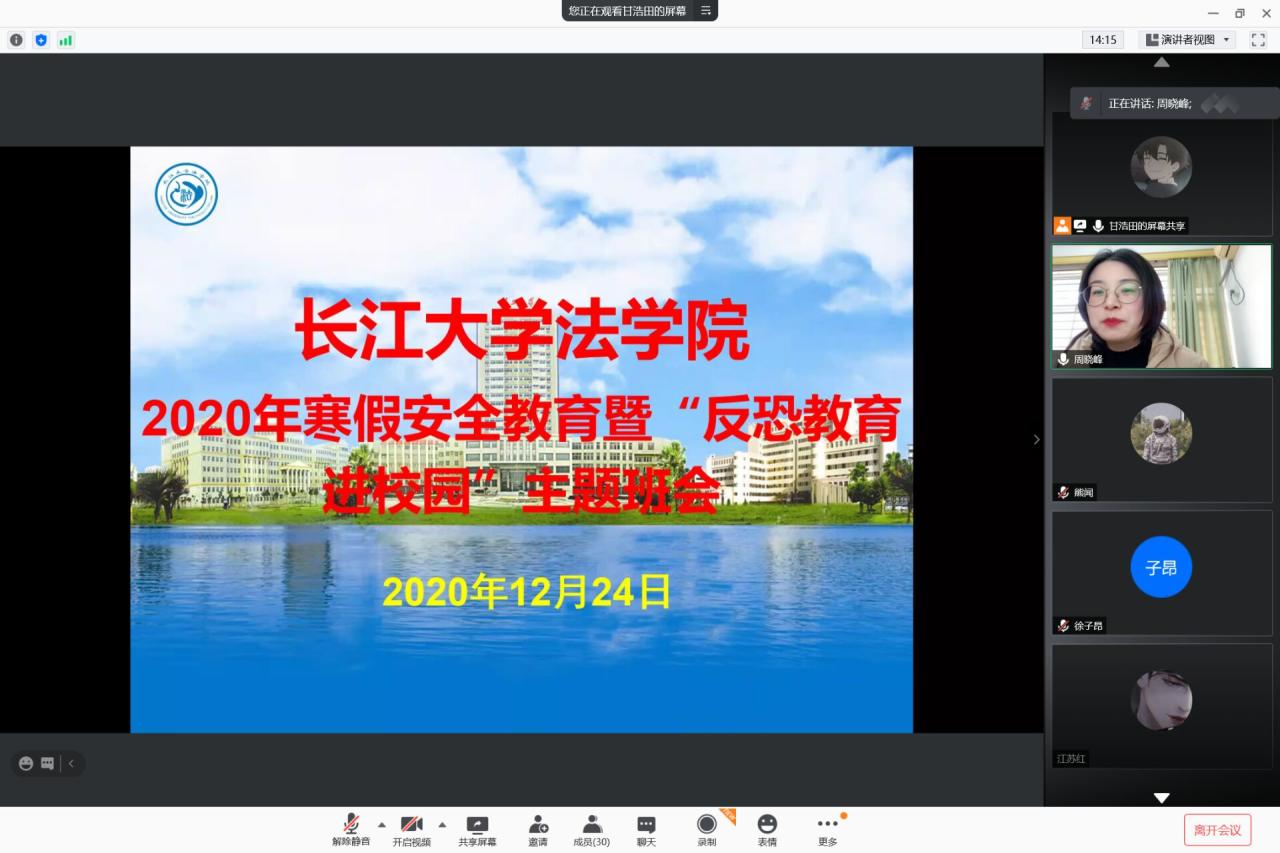 此次主题班会以线上的形式召开。首先,班会从防盗、防骗、防火防电、交通安全以及疫情防控等方面进行了宣讲,重点强调了:在家坚持“两勤两常两保持”(勤洗手、勤通风,常戴口罩、常分餐,保持社交距离、保持公共卫生清洁),希望同学们度过一个安全愉快的寒假。