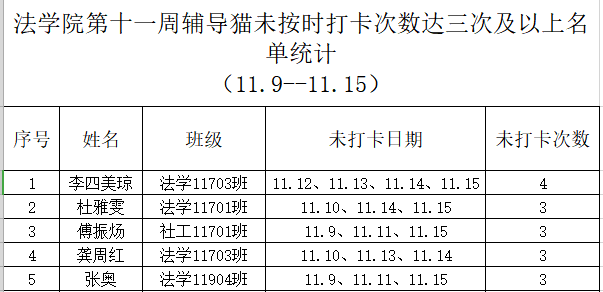 根据公司要求,2020年11月9日-11月15日组织全体本科生进行每日“辅导猫”打卡。经分管辅导员、学工助理、班干部多次提醒,仍有5名同学未在规定时间内完成打卡,具体未打卡次数及日期如下:(表格显示)