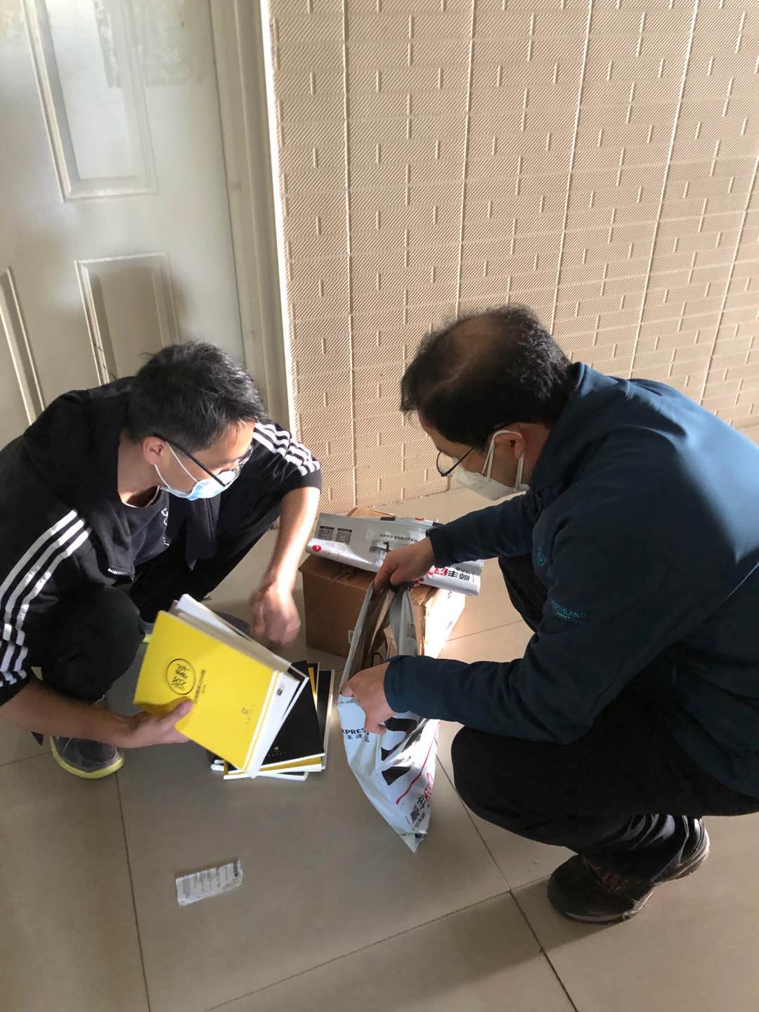 从上午9点一直忙到下午5点,从进入宿舍开始,找寻物品、打包、贴标签,每个过程都在员工视频确认下进行。当天为75名同学集中办理了电脑、学习资料、重要证件的邮寄工作。