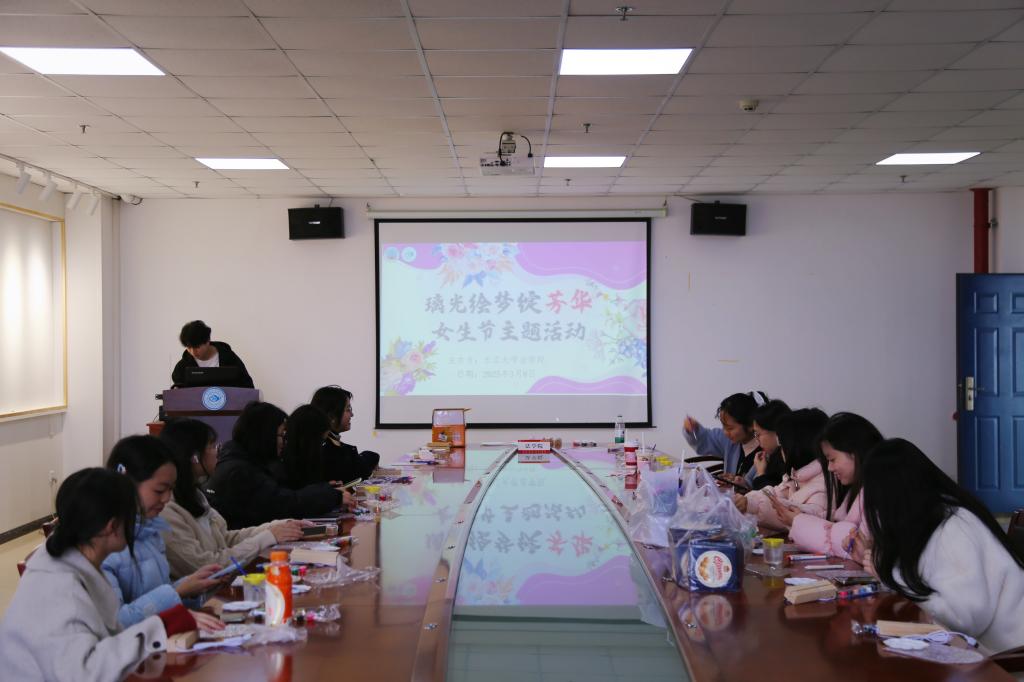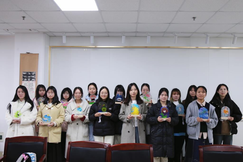 随后的玻璃画 DIY 环节,将现场气氛推向高潮。主持人曾祥上台,细致讲解玻璃画制作全流程,从工具正确使用、颜料精准调配到图案创意绘制技巧,条理清晰、干货满满,帮助同学们快速掌握创作要领。讲解结束后,同学们迅速投入创作,现场灵感迸发、创意十足:有人绘出娇艳绽放的玫瑰,象征女性坚韧不屈又美好温柔的特质;有人勾勒灵动可爱的小动物,展现女性活泼俏皮的一面;还有人设计独特抽象图案,大胆表达内心的想法与态度。创作过程中,同学们相互交流经验、主动伸出援手,分享创意心得的同时共同攻克制作难题,现场氛围热烈又温馨。