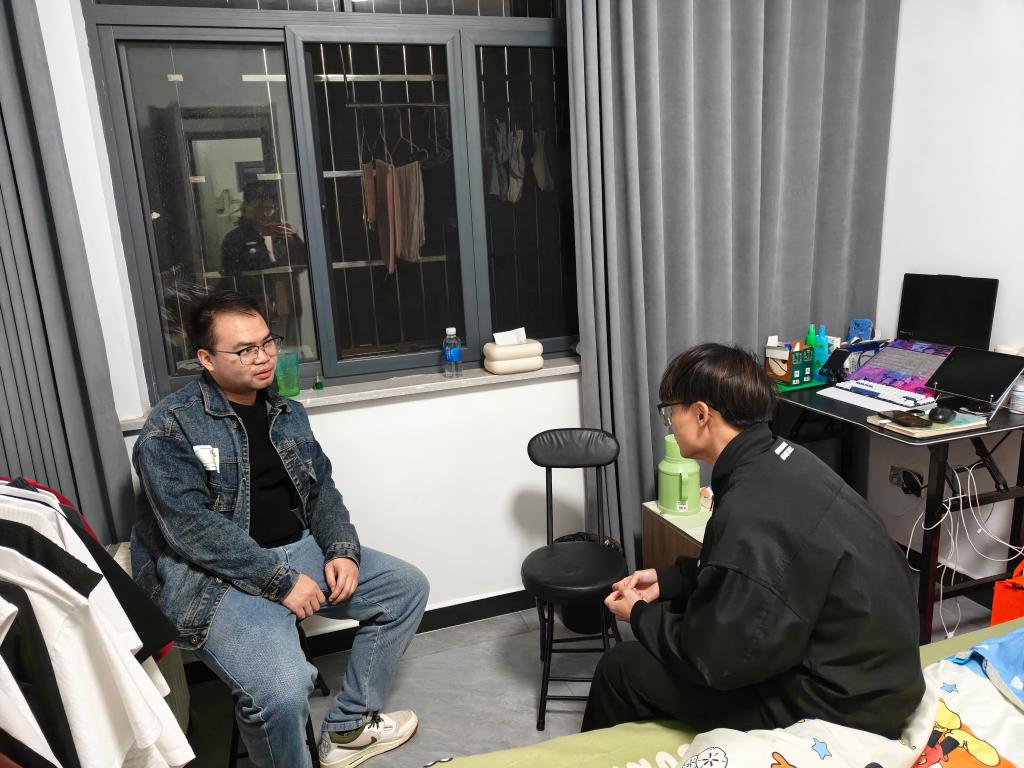 随后,雷礼老师抵达宋佳伟家。交流中发现,宋佳伟因“考研冲刺” 与 “求职准备” 两难,加之家境压力,情绪焦虑。辅导员结合社会工作就业趋势与其学习基础,分析两条道路适配性,建议其依职业规划理性决策,同时分享心理调节方法,鼓励道:“无论选哪条路,公司都是你后盾。” 一番疏导让宋佳伟平复心绪,明确先专注求职,后续会及时沟通进展。