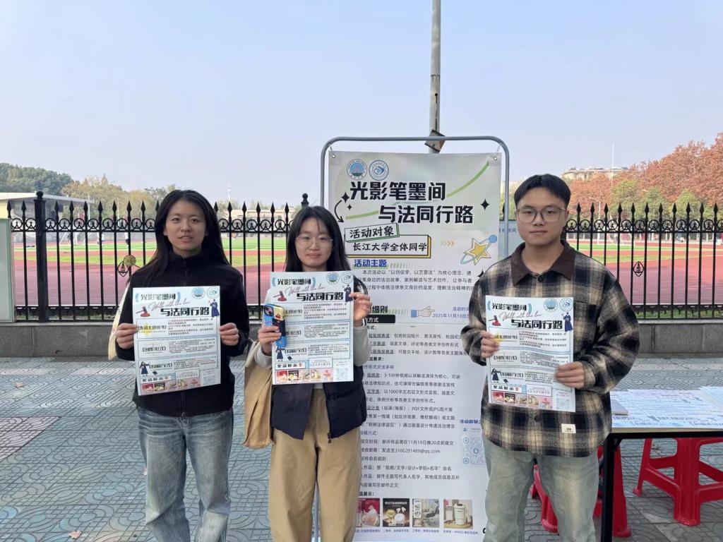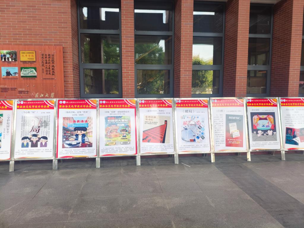 11 月 20 日至 21 日,活动进入作品评选与展览阶段。评审团严格遵循 “原创性、法治性、思想性、艺术性” 原则,从法理阐释精准度、传播感染力、视觉表达效果等维度综合考评,最终评选出各赛道一、二、三等奖。优秀作品在东校区文科大楼一楼长廊集中展览,内容涵盖反诈警示、未成年人保护、AI 换脸侵权、校园贷治理等多元主题:主题海报以直观视觉语言呈现法治场景,短视频通过情景演绎普及法律知识,文字作品或深度解读法条、或讲述身边法治故事,兼具专业深度与人文温度。展览现场,师生驻足观摩、交流探讨,在沉浸式体验中深化法治认知,让尊法学法守法用法理念入脑入心。