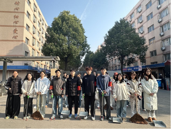 清扫现场,同学们迅速投入劳动状态,分工明确,各司其职。在员工宿舍楼区域,一组同学们对楼道地面进行了逐层清扫与拖洗,重点清除了楼梯转角、电表箱周边等隐蔽角落的积尘与杂物;另一组同学则专注于公共走廊窗户玻璃、防火门及各类标识牌的清洁,并使用长柄工具清除高处灰尘;对于绿化带及人行通道,同学们仔细捡拾落叶、纸屑等垃圾,不放过任何一个卫生死角。在整个清扫过程中,同学们发扬不怕脏、不怕累的精神,相互协作,配合默契。初冬的微寒被劳动的热情所驱散,场所内外一派热火朝天的景象。经过全体同学两个多小时细致认真的清扫劳动,主要打扫区域和附近的公共环境面貌得到显著改善。