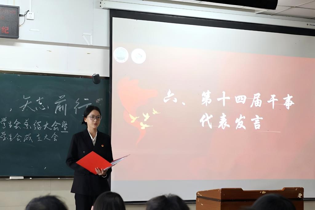 大会第四项,团委书记吴敏宣读第十四届团委员工会成员名单,对新成员的加入表示热烈欢迎。新鲜血液的注入,为员工会带来了新的活力与可能。紧接着,第十四届团委员工会主席团成员代表黄世威作表态发言,围绕 “深耕学风建设,营造优良学术氛围”“彰显专业特色,打造品牌文化活动”“强化服务意识,切实解决同学需求” 三个核心方向作出工作承诺,清晰的规划与坚定的态度,充分展现了新一届主席团的责任担当。