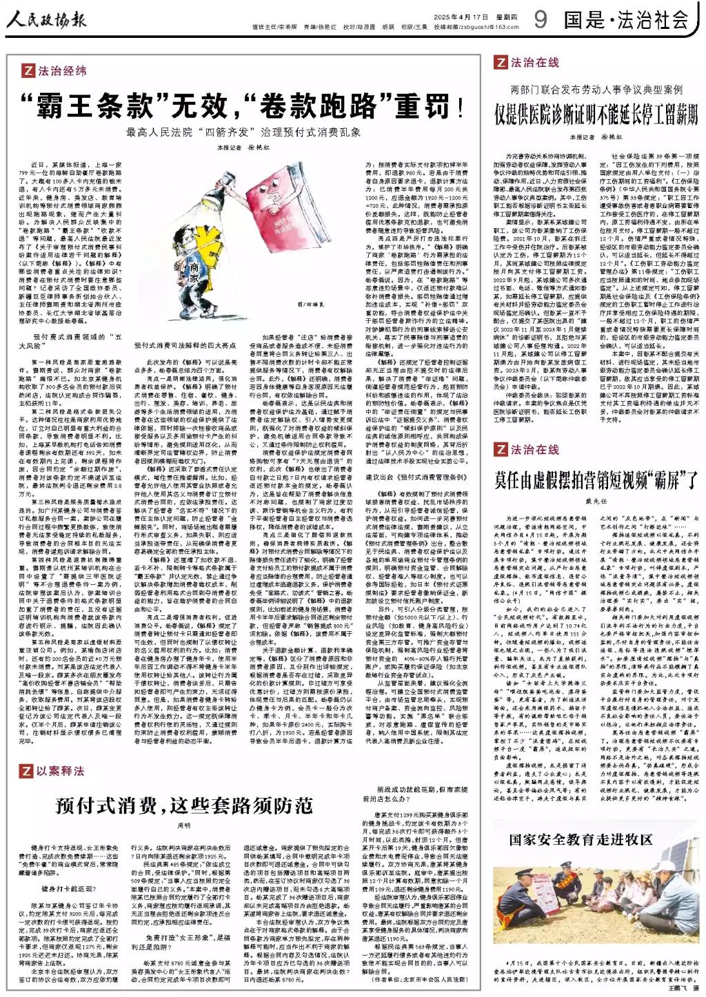 在预付式消费领域乱象频发的背景下,杨春磊教授继去年在《人民政协报》发表社会治理对策文章《如何惩治职业闭店人》后,于2025年4月16日再次就该热点话题接受采访,结合最高人民法院最新发布的《关于审理预付式消费民事纠纷案件适用法律若干问题的解释》(以下简称《解释》),深入解读司法新规对“卷款跑路”“霸王条款”等问题的治理路径,充分展现了公司在基层治理研究领域的前沿性与实践导向。