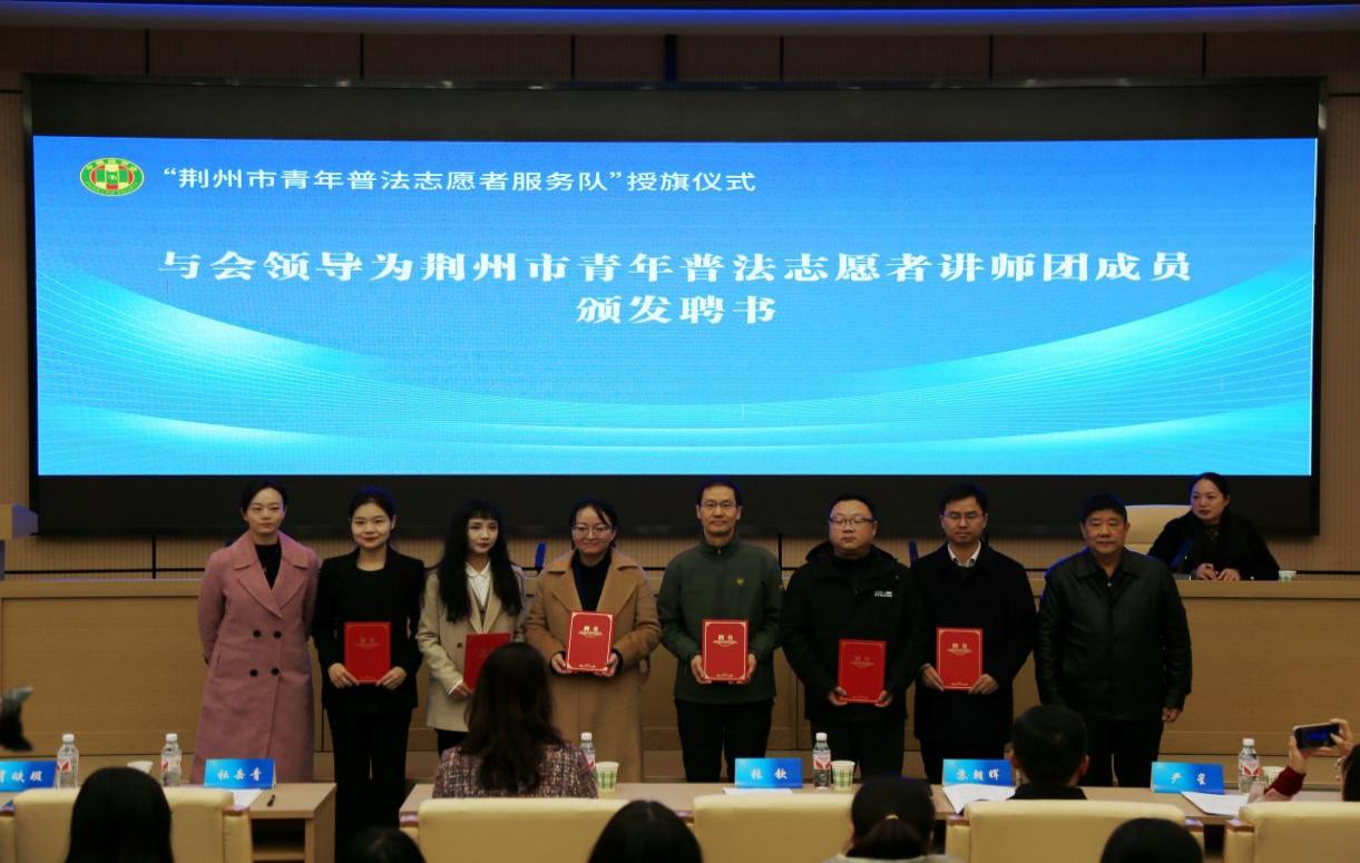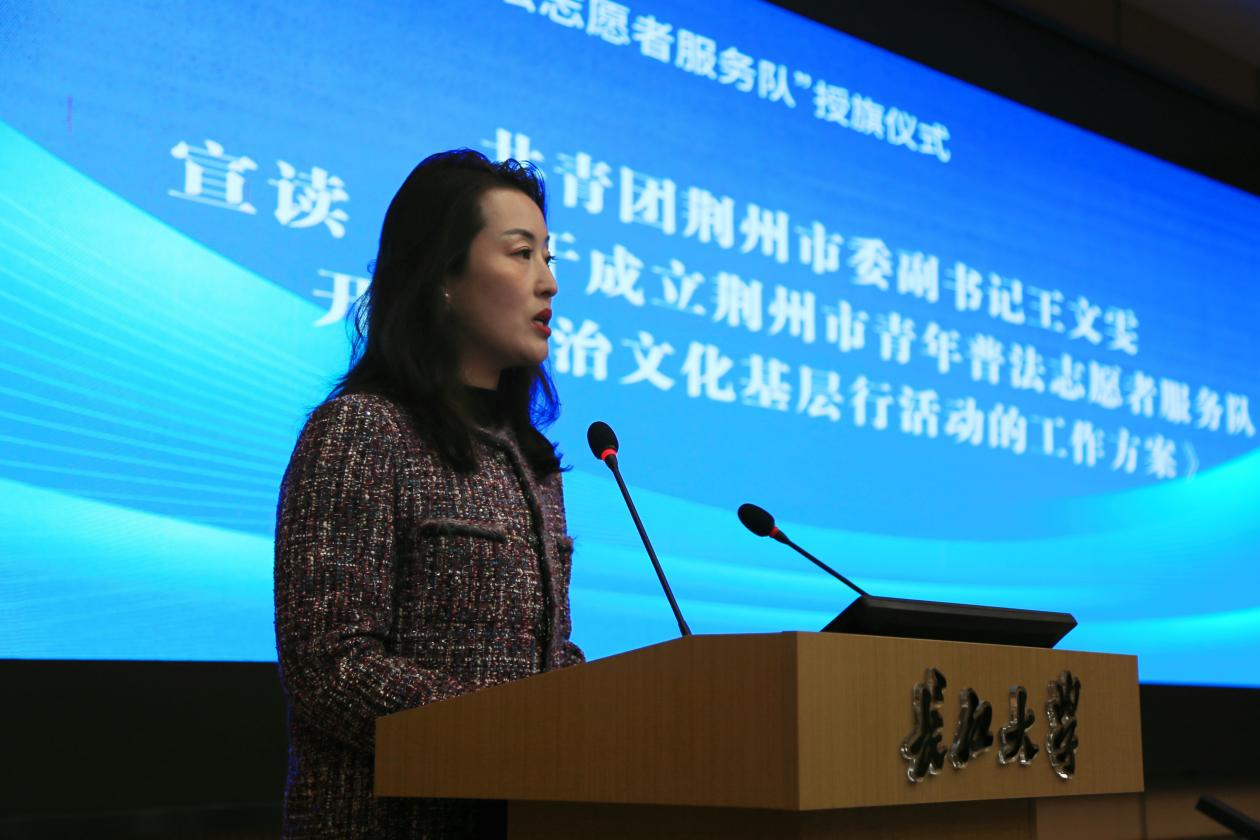 随后,在热烈的掌声中,授旗仪式正式开始,王文雯为“荆州市青年普法志愿者服务队”授旗。