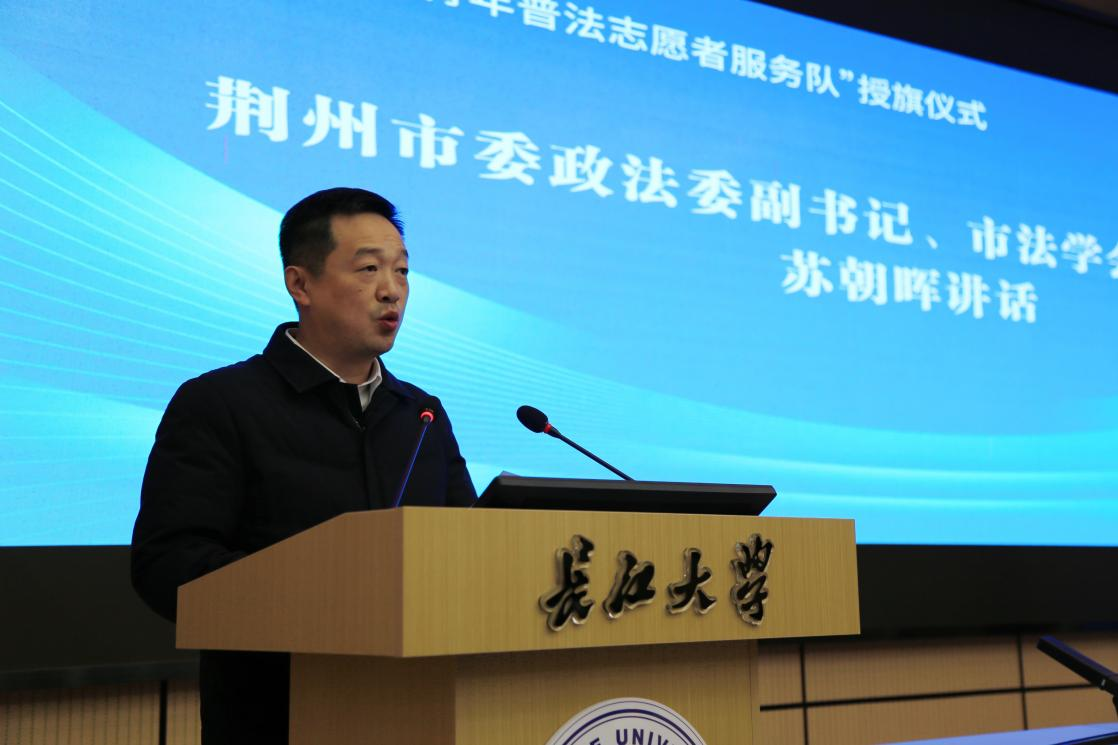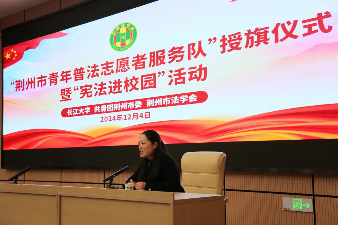 (通讯员张屾岚王泽宇/文 解凌逍/摄)为深入贯彻党的二十届三中全会精神,加强法治宣传教育,推动青年普法志愿活动深入开展,2024年12月4日,荆州市青年普法志愿者服务队成立仪式在beat365官网中文东校区11教学术报告厅举行。仪式由荆州市法学会专职副会长、秘书长廖淑洁主持,荆州市法学会会长张钦,市委政法委副书记、市法学会常务副会长苏朝晖,团市委副书记王文雯,beat365官网中文校团委副书记杜岳青,beat365官网中文公司党委副书记严星出席授旗仪式,市法学会办公室有关负责人、讲师团成员及百余名beat365官网中文的青年普法志愿者代表们参与仪式。