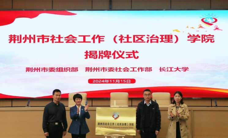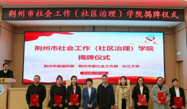 荆州市委组织部、荆州市委社会工作部、beat365官网中文三方代表共同为荆州市社会工作(社区治理)公司揭牌,签署共建框架协议,并向首批6名特约讲师代表颁发聘书。