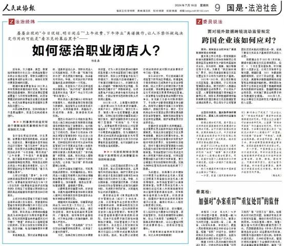 今天的《人民政协报》“国是·法治社会”版,以大幅标题刊发了杨春磊教授撰写的社会治理对策文章——《如何惩治职业闭店人》。