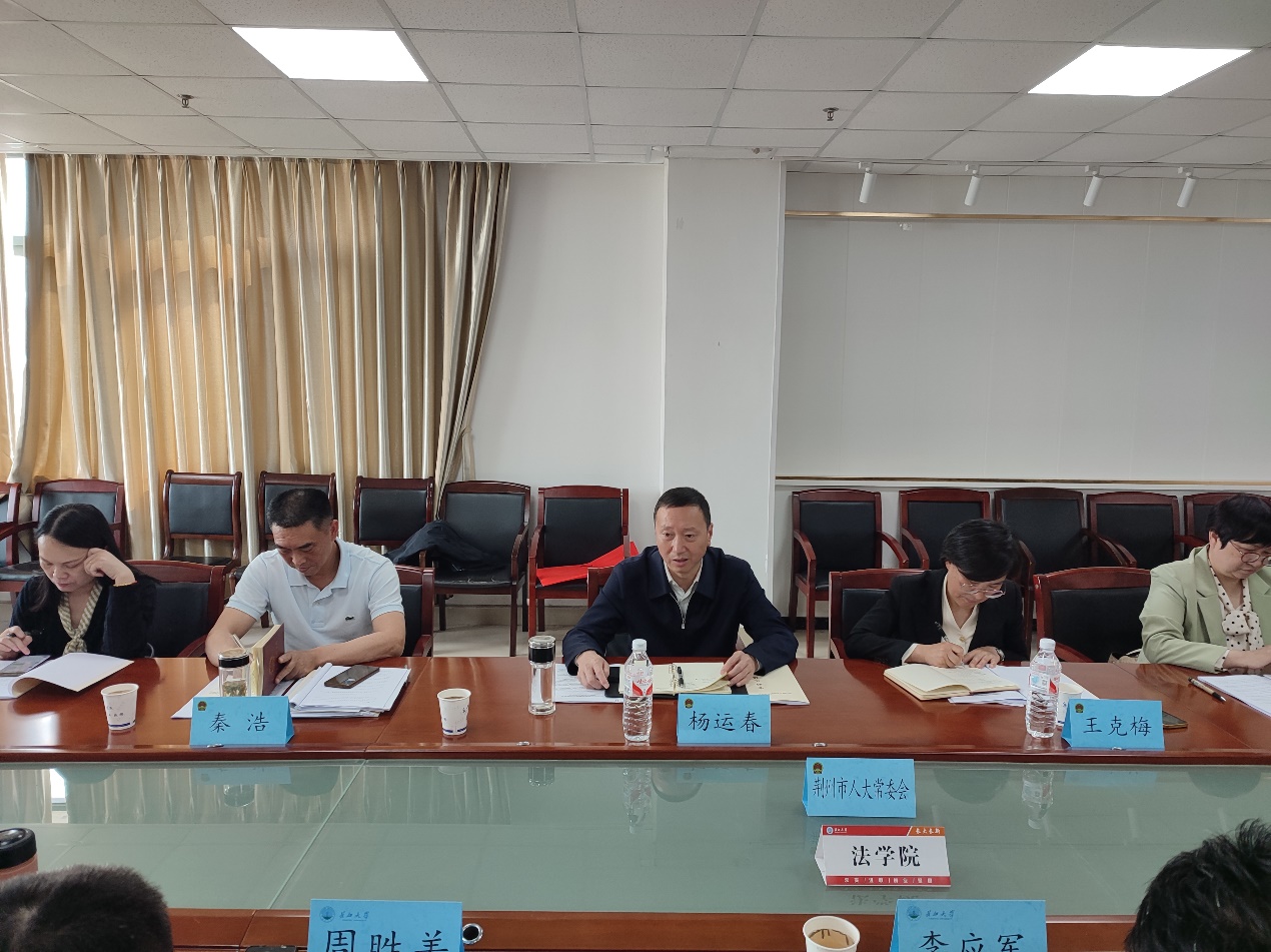 4月18日,荆州市人大常委会副主任杨运春与市人大法制委员会一行赴beats365指导基层立法联系点工作,并就《荆州市养犬管理条例(草案)》和《荆州市沮漳河流域水环境保护条例(草案)》征求公司师生的意见。杨运春首先肯定了beats365自2016年首次获批基层立法联系点以来,一直常态化开展地方立法调研、咨询工作,并积极参与了多部地方性法规的起草、论证工作,为荆州市立法工作的高质量发展贡献了长大智慧。他希望公司师生将深厚的法学理论与具体社会实践紧密联系起来,坚持问题导向,做到开门立法,通过深入生活、深入一线基层,努力使地方立法服务地方治理需求。