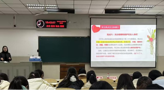 讲座伊始,杨琳丽老师以鲜活的案例作为开场,讲解案例并分析背后的法律依据,在新法的同时,也强调了新法的出台是妇女权益保障事业的一大进步,为妇女在社会各个领域的平等参与和发展提供了强有力的法律支撑。