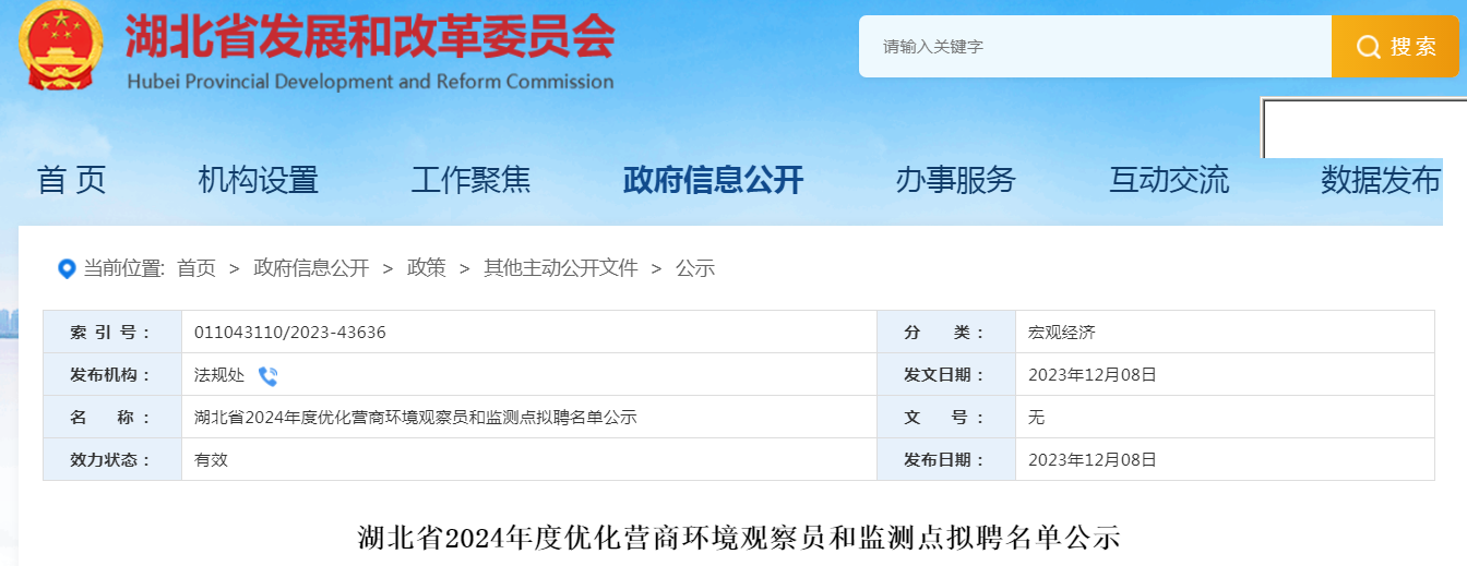经湖北省优化营商环境领导小组公开选聘,李华成教授受聘为新一届优化营商环境观察员(2024.01—2024.12)。观察员职责主要有:(1)发现、收集和反馈在营商环境建设中的正反两方面现象;(2)监督和反映全省各地各单位贯彻落实《优化营商环境条例》、《湖北省优化营商环境条例》、省委、省政府出台的有关营商环境重要文件、依法行政、政务公开、行政审批等情况;(3)监督全省各地各单位推进法治政府、诚信政府建设情况等。