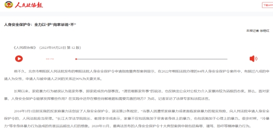 2023年5月,北京市朝阳区人民法院发布的朝阳法院人身安全保护令申请指南暨典型案例显示,在2022年朝阳法院办理的44件人身安全保护令案件中,有超过八成的申请人为女性,申请人与被申请人之间的关系近90%为夫妻关系。对此《人民政协报》就此问题采访了法律专家和法院法官。李华成教授接受采访时指出,家庭暴力行为的特殊性需要人身安全保护令的介入。人身安全令从公权力的角度教育并规制了施暴者的行为,成为施暴者与受害者之间的“隔离墙”。李华成教授建议,要进一步完善家暴的发现机制,施行强制报告制度;要细化公安机关等部门协助执行的具体内容,保证保护令期内被申请人的各项义务得到充分履行;居委会、村委会等应定期回访,跟踪记录保护令的执行情况并及时向法院反馈;在执行过程中要注重引入心理疏导机制,加强对受害人的心理救助。
