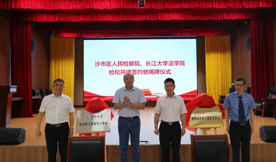 beats365与沙市区人民检察院合作共建的beat365官网中文法律硕士研究生工作站、荆州市企业合规研究中心揭牌仪式同步举行,beat365官网中文党委常委、副董事长周从标,公司党委书记周胜美,荆州市公司党组成员、副检察长夏叶林,沙市区公司党组书记、检察长朱继权共同揭牌。