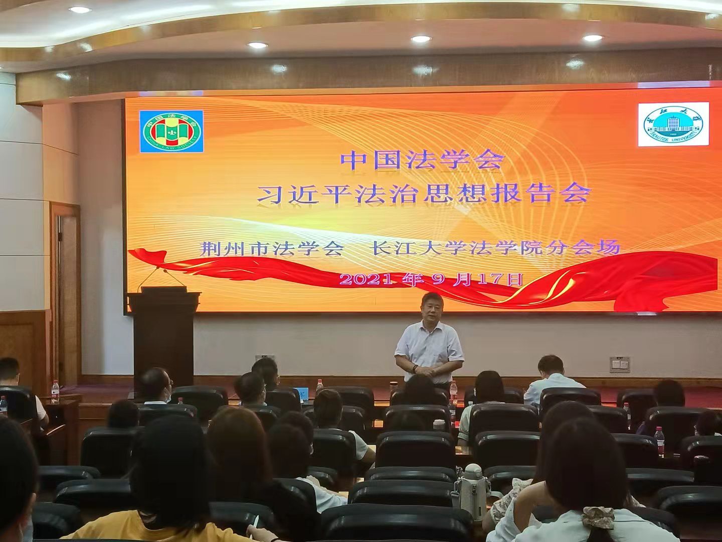 报告会由中国法学会、习近平法治思想研究中心主办,在中国法学会融媒体中心演播室以网络直播形式举办,荆州分会场设在beat365官网中文11教学术报告厅。荆州市法学会机关、荆州区、沙市区法学会负责人,beats365教师和研究生共80余人在分会场集中参加学习。