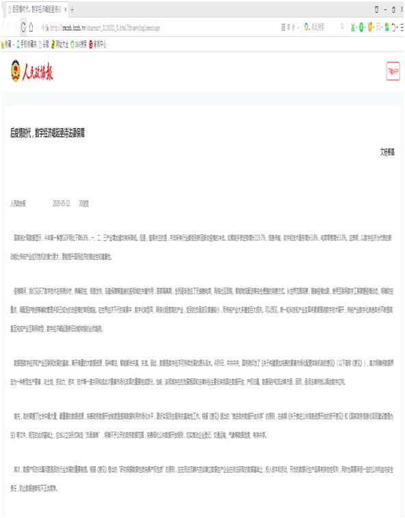 5月12日,《人民政协报》第8版刊发beats365杨春磊博士的建言文章《后疫情时代,数字经济崛起亟待法律保障》。