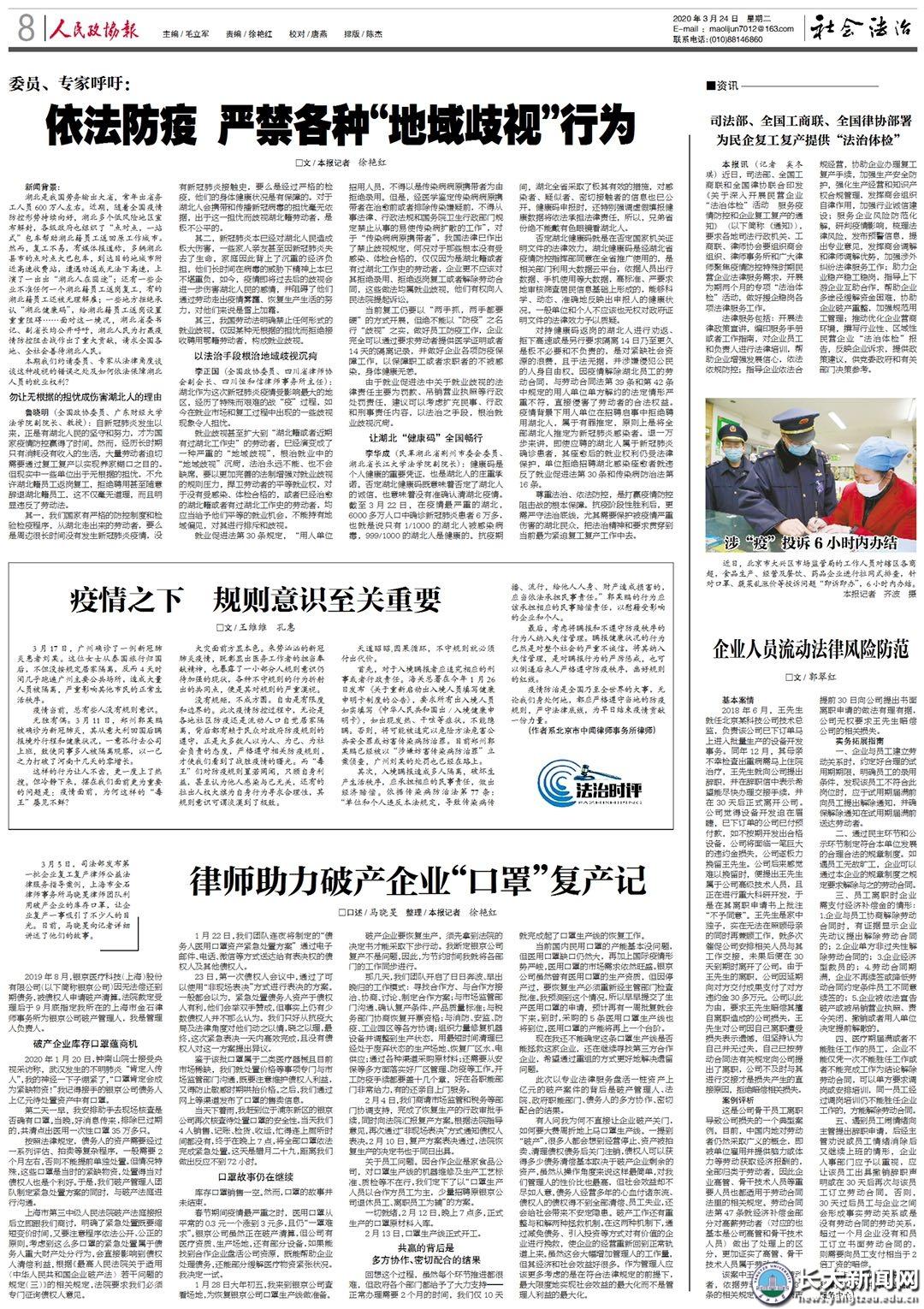 全国政协机关报《人民政协报》2020年03月24期第8版暨社会法治版以“让湖北健康码全国畅行”为题全文刊登beats365李华成博士的建言献策文章。