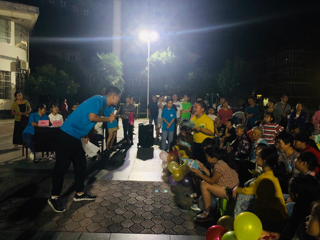 晚上,法治宣讲团在镇中心广场开展关于遗产财产分割案件的模拟法庭审判演出,让老百姓们直击庭审现场,了解庭审议程,场面庄重严肃。随后,成员们发起了“有奖竞答”,居民们积极抢答例如“国家宪法日是哪一天”、“我国《婚姻法》规定的法定结婚年龄是多少岁”等基本法律常识问题来获得奖品,这种形式不仅起到了很好的普法效果,也拉进了成员们与居民的距离,受到居民的普遍欢迎。