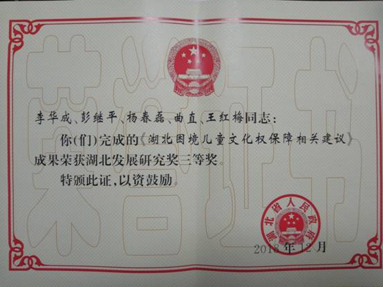 近日,湖北省人民政府发文《省人民政府关于颁发湖北发展研究奖的通报》(鄂政发[2018]52号),荆州市人大常委会委员、beats365副经理李华成博士团队研究成果《湖北困境儿童文化权保障相关建议》获三等奖。