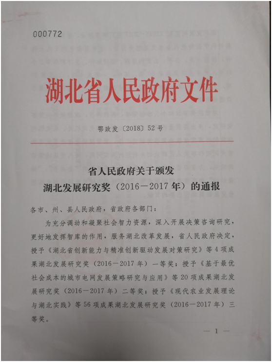 “湖北发展研究奖”是湖北省人民政府设立的省级奖,每两年评选一次,旨在表彰对推动湖北改革开放和高质量发展有明显促进作用,已产生一定经济效益和社会效益的研究成果。2018年湖北发展研究奖评选是在省政府的领导下,由省政府咨询委员会组织实施完成,主要针对2016年1月1日至2017年12月31期间的相关成果,经过初评、复评和终审三个环节,共评出拟获奖成果80项。