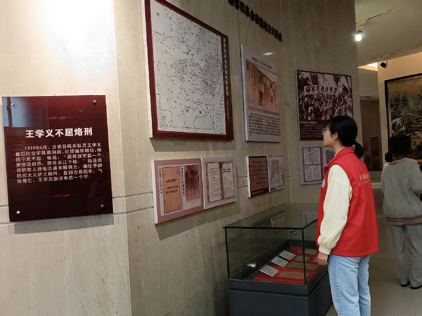 在讲解员的引导下,成员们走进烈士纪念馆。一张张泛黄的历史照片、一件件承载记忆的珍贵文物,生动再现了革命先辈为民族独立、人民解放浴血奋战的峥嵘岁月。其中,1928年5月公安县暗杀队员王学义的英雄事迹令人动容。他被国民党军队抓捕后遭受严刑拷打,即便遍体鳞伤仍宁死不屈,面对敌人“要想招供,除非长江干枯”的回应掷地有声。最终,敌人将其衣物剥光、捆绑手脚,架火施烙刑,直至他全身焦烂、气绝身亡,始终未吐露一字。先辈的铁血精神深深震撼着每一位青年,让大家深刻感悟革命胜利的来之不易,进一步坚定了“听党话、跟党走”的理想信念。